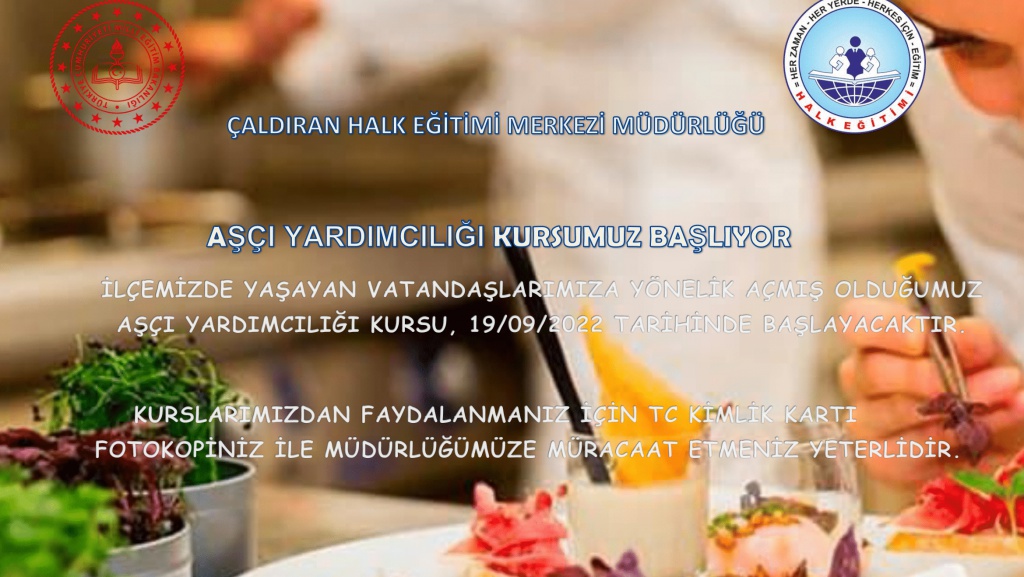 SİZ DEĞERLİ VATANDAŞLARIMIZ TARAFINDAN YOĞUN İLGİYLE KARŞILANAN "AŞÇI YARDIMCILIĞI" KURSUMUZ 19/09/2022 TARİHİNDE BAŞLAYACAKTIR. MUTFAK SANATLARINA İLGİ DUYAN TÜM VATANDAŞLARIMIZ KURSUMUZA DAVETLİDİR. KURSLARIMIZA KATILMAK İSEYENLERİN TC KİMLİK KARTI FOTOKOPİLERİ İLE BİRLİKTE KURUMUMUZA MÜRACAAT ETMELERİ YETERLİDİR.